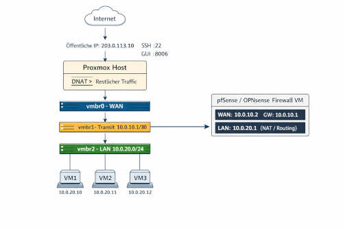 - vmbr1: Transit-Bridge (10.0.10.0/30) für pfSense-WAN